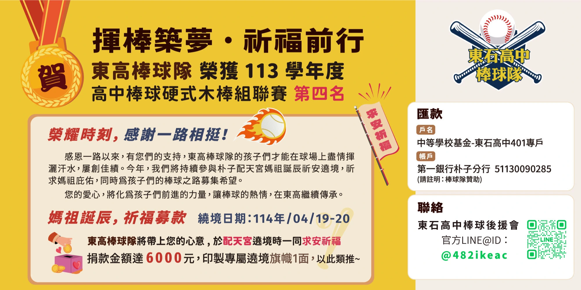 參與贊助捐款活動將由碧豐紙品印製專屬企業、公司或個人旗幟,由球隊孩子們帶上您的心意,於配天宮遶境求安祈福。‧ 遶境日期:2025/04/19-20‧ 旗幟捐款日期:即日起~4/15日(二) 截止‧ 捐款帳戶戶名:中等學校基金-東石高中401專戶帳號:第一銀行 朴子分行 51130090285 ‧ 聯絡人東石高中棒球後援會官方LINE@ID:@482ikeac ( 如需減抵年度所得稅,請與校方連絡,並請提供校方必要寄件通訊資訊 ) - - 旗幟對稿方式⚑ 捐款贊助旗幟確認後,請私訊或連絡之窗口提供「 旗幟名稱、數量 」,捐款金額達6000元,印製專屬旗幟1面,依此類推~✎░ 旗幟對稿方式:透過連絡窗口 或 可加入 #碧豐紙品包裝設計有限公司 官方LINE@ (ID:@FQK1697L /連結:https://lin.ee/uAEGcp2),並通知贊助媽袓繞境【旗幟對稿】。 - 夢想同路 #贊助者 #東石高中棒球後援會 感謝這一路上有你相伴同行,讓東石高中棒球隊攜手揮灑青春,也讓成長的旅程更加精彩! |