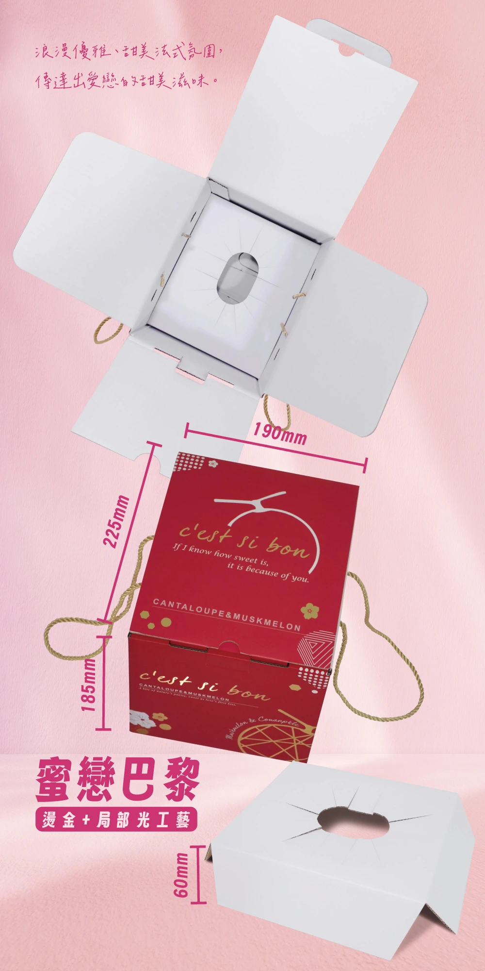 禮盒有一種浪漫優雅、甜美的法式氛圍,使 哈密瓜/洋香瓜 香甜水果,傳達出愛戀的甜美滋味。