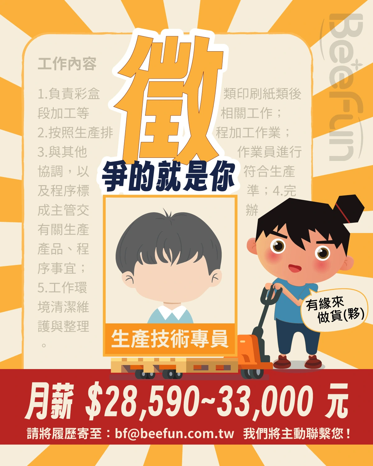 碧豐紙品誠徵 👉 生產技術專員 一名