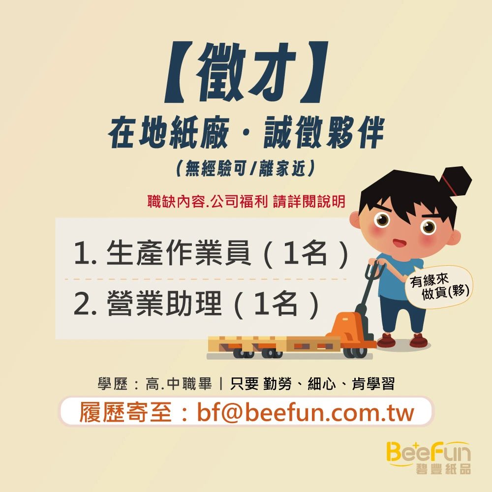 履歷寄 bf@beefun.com.tw 我們將主動聯繫您! 歡迎踏入印刷包裝產業、學一技之長!